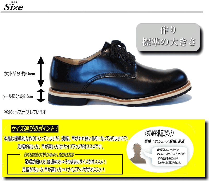 | サイズ | 作り⇒標準の大きさ 【サイズ選びのポイント!】 足幅が細い方、普通の方⇒そのままのサイズがオススメ! 足幅が広い方、甲が高い方⇒1サイズアップがオススメ! ▼ご確認下さい!▼ 本品は標準的な作りになっていますが、横幅、甲がやや狭い作りになっておりますので、足幅が広い方、甲が高い方は1サイズアップがオススメです。 |