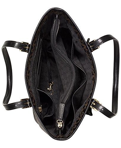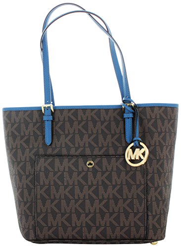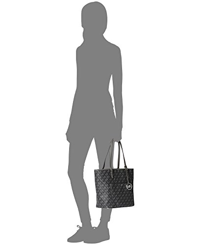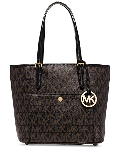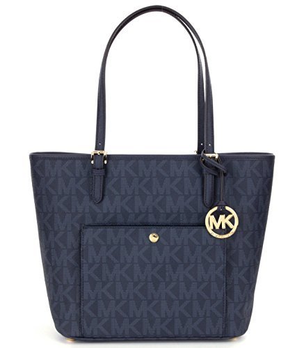 Working for the weekend? This sophisticated snap-pocket tote goes from the office to out-to-lunch in MICHAEL Michael Kors' signature glossy PVC. Glossy MK signature PVC; lining: polyester Double handles with 9" drop Open top Exterior features shiny rhodium hardware and 1 snap pocket Interior features center zip divider pocket, 1 zip pocket, 3 open pockets, 1 cellphone pocket and key fob 14" W x 11" H x 5" DFeature