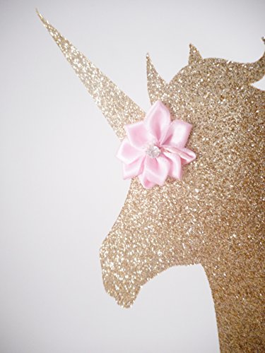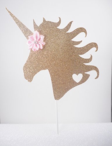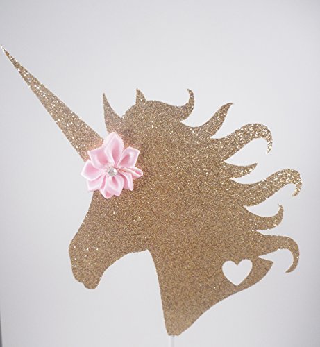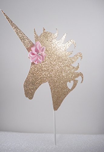 Product Description Gold Glitter Unicorn Head Cake Topper with a Pink Flower Ribbon Rhinestone Embellishment. Unicorn Head Measures approx 5 3/8"W x 6"H Made from glitter cardstock - front side gold glitter, white on backside 0