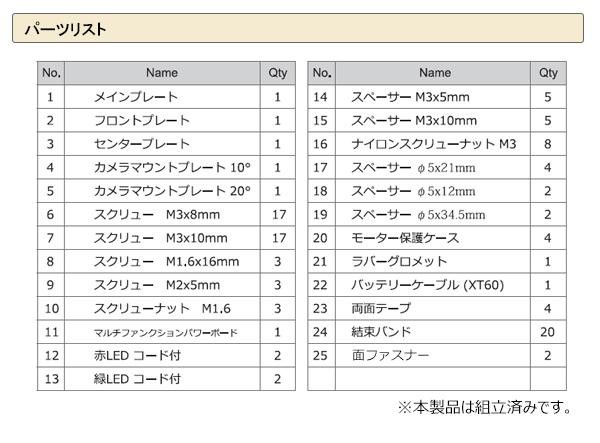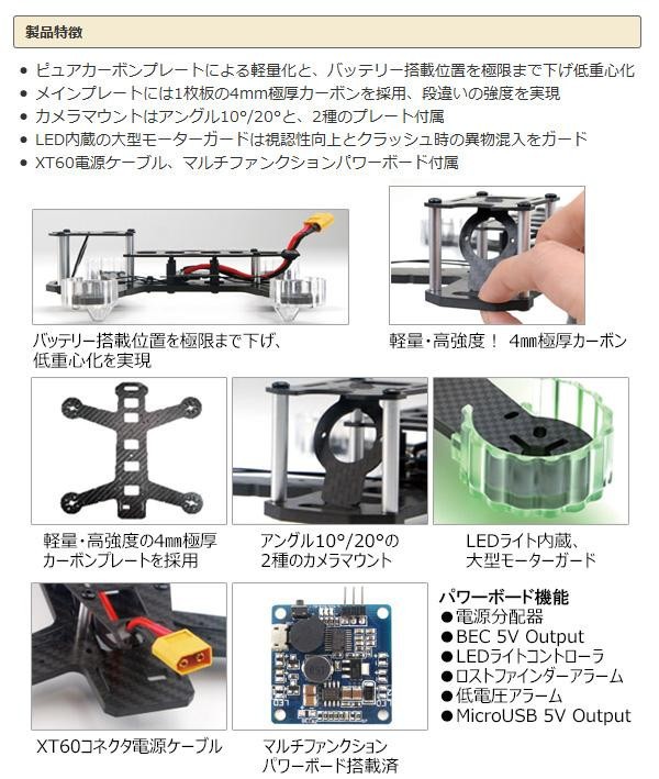 | ピュアカーボンプレートによる軽量化と、バッテリー搭載位置を極限まで下げ低重心化。メインプレートには1枚板の4mm極厚カーボンを採用、段違いの強度を実現。LED内蔵の大型モーターガードは視認性向上とクラッシュ時の異物混入をガード。XT60電源ケーブル、マルチファンクションパワーボード付属。 |