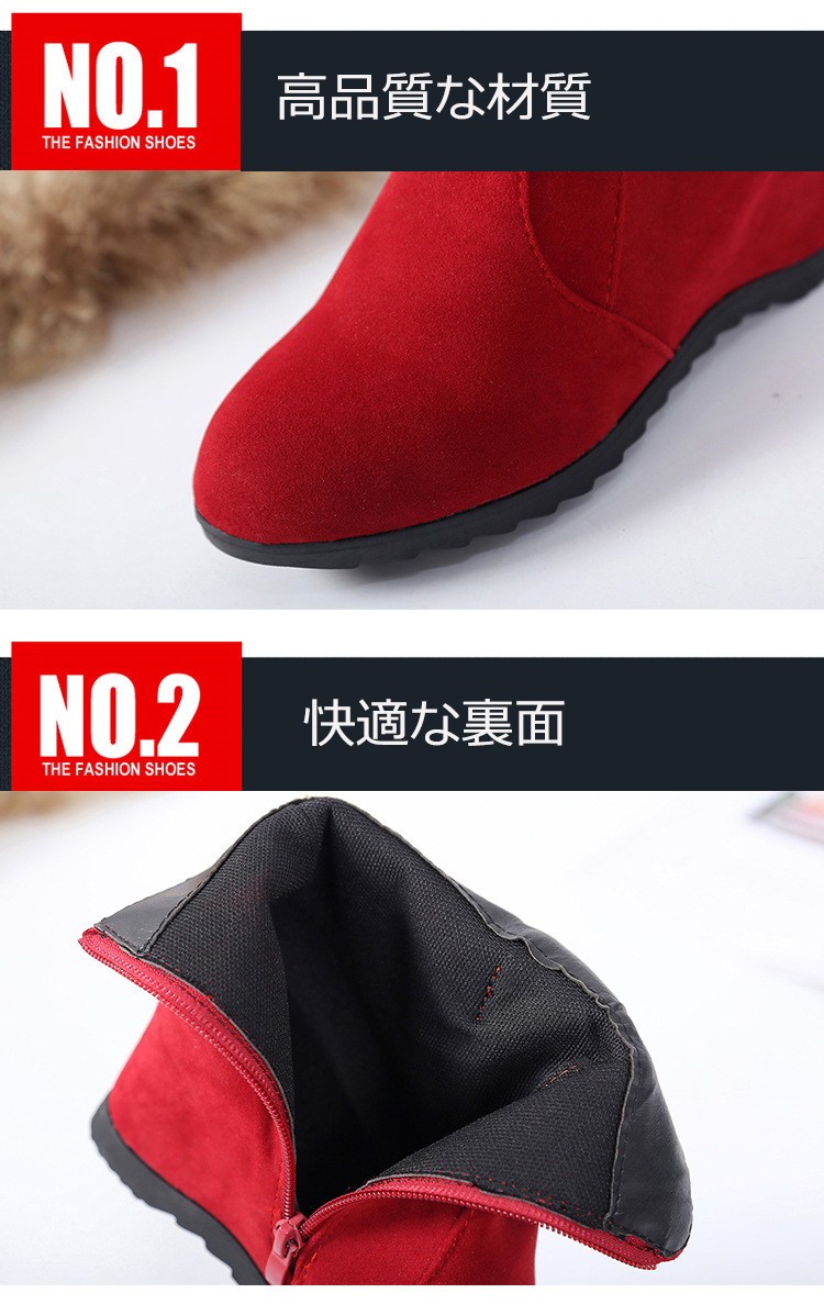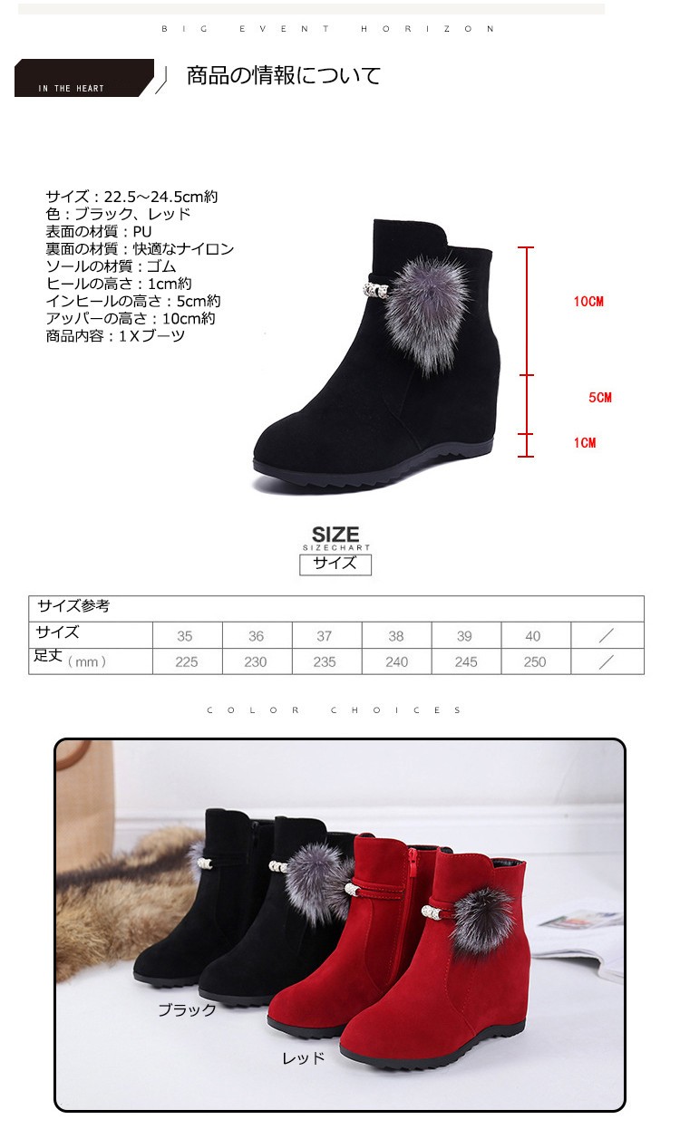 色:ブラック、レッド表面の材質:PU裏面の材質:快適なナイロンソールの材質:ゴムヒールの高さ:1cm約インヒールの高さ:5cm約アッパーの高さ:10cm約サイズ:22~24.5cm約商品内容:1x靴サイズ:34:22cm 35:22.5cm 36:23cm 37:23.5cm 38:24cm 39:24.5cm 40:25cmショートブーツレディース ヒール 女性のアンクルブーツ シューズ ファスナー式靴 秋冬物 シンプル くつレディース用のアンクルブーツが登場ハイヒールの靴なので、美脚ですカラーもシルエットもとても組み合わせしやすくて、どんな場合にも使える上品な一足