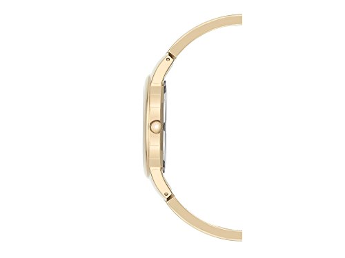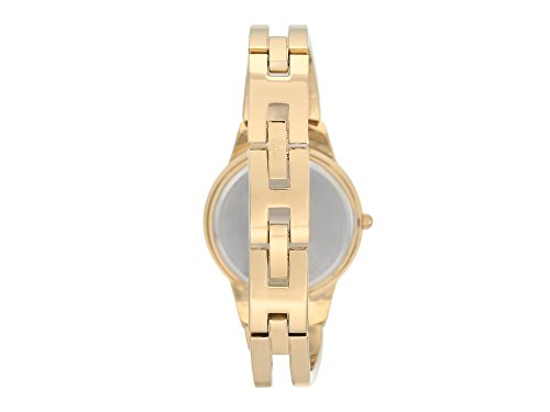 Be a shining example of punctuality and elegance in an open link bangle watch from Anne Klein. Its glossy black dial set with a genuine diamond at the 12 o-clock hour adds a touch of class. Chic for business or after hours, this ladies' designer timepiece has a polished goldtone bracelet you can easily adjust with extra links for the best fit and it fastens sleekly with a jewelry clasp.Feature
