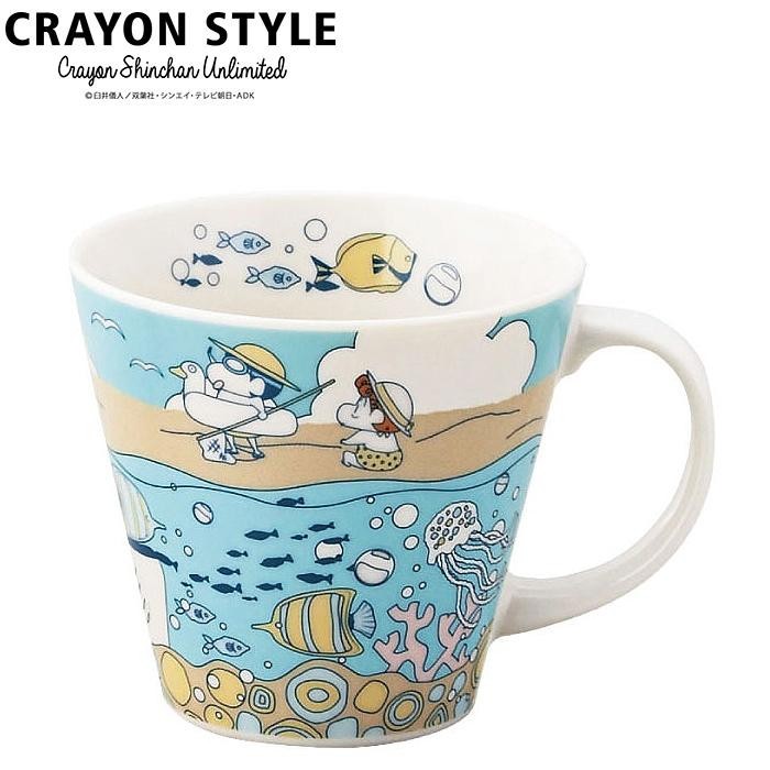 海水浴に行くしんちゃんたちのイラストが夏らしい、涼しげなデザインのマグです。ご自宅用はもちろん、ギフトにもオススメです。