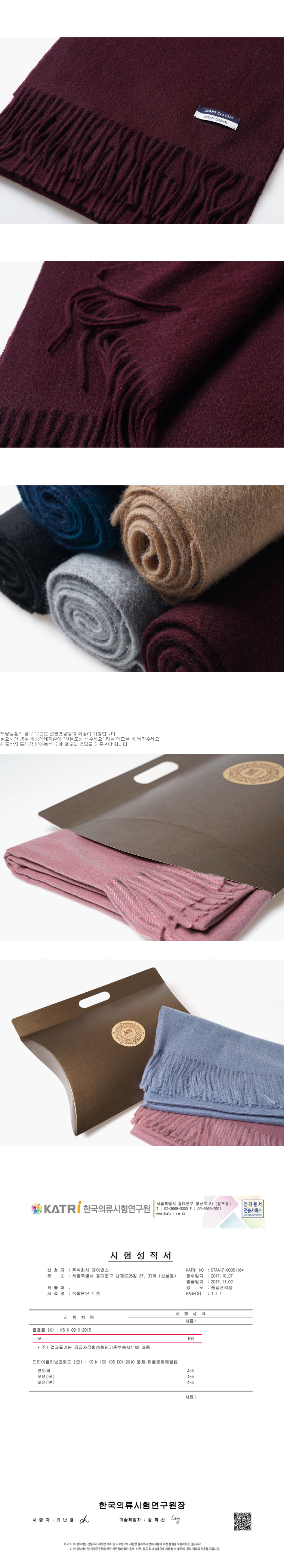 소재 - 울(모) 100% 색상 - 와인 사이즈 - 약169cm x 약31cm 제조사 - ㈜제이반스 제조국 - 중국OEM 제조년월 - 2017.10 이후