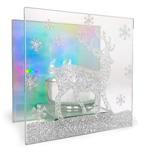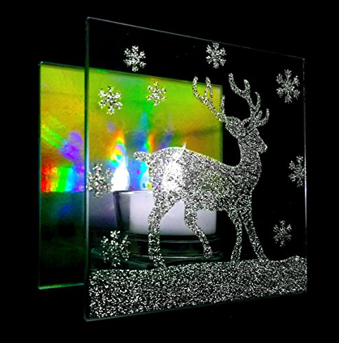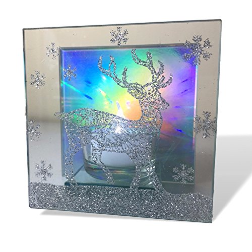 Christmas Candleholder - Glittered Reindeer Silhouette on a Glass Infinity Holder - Rainbow Reflection Lights