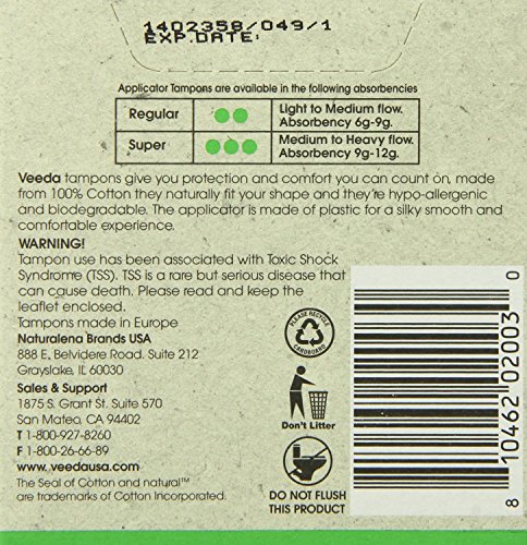 Studio : Veeda Publisher : Veeda Binding : Health and Beauty Product Description Veeda Tampons provide the comfort and reliability you value without compromising your health or our precious environment. Free of chemicals, synthetic fibers, additives and pesticides, you can be sure that only the softest, purest, most hypoallergenic material on earth comes in contact with your skin--100% Cotton. All our cotton is prepared using oxygen-based cleansing agents for a totally chlorine-free, dioxin-free, and pesticide-free product.