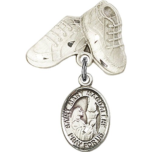 -. Title : Sterling Silver Baby Badge with St. Mary Magdalene Charm and Baby Boots Pin 1 X 5/8 inches