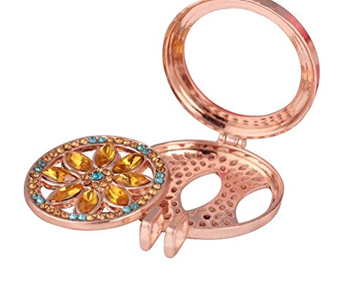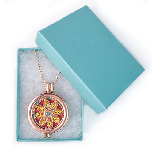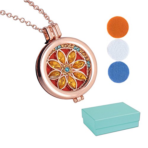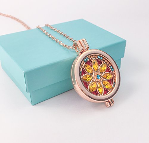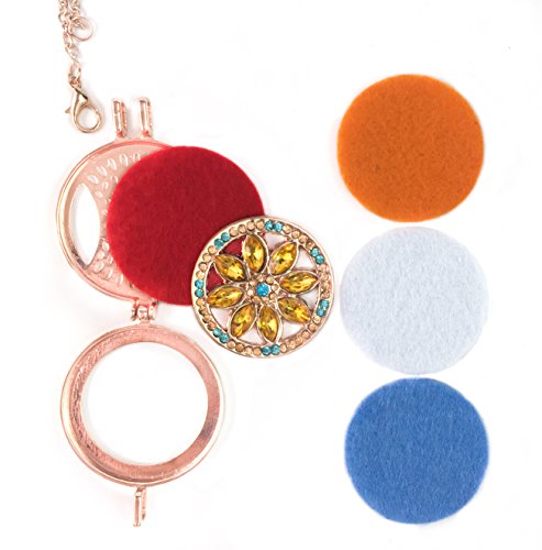 - PENDANT DIFFUSER - Stand out with this beautifully crafted aromatherapy diffuser necklace in rose gold that shines with bright gemstones. Just a few drops of essential oils onto the interchangeable pads and you can smell your favorite scents all day. Pendant measures 1 3/8 inches in diameter and 2 inches long including the bolts. Chain measures 24 inches long.