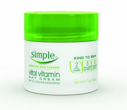 -. Feature : One 1.7-ounce bottle of Vital Vitamin Day Cream with SPF 15 from Simple / Moisturizes and soothes while protecting skin all day with UVA/UVB SPF 15 Sunscreen / With added vitamins: Pro-Vitamin B5 and Vitamin E; Contains skin-loving ingredients: Glycerin, Allantoin and Bisabolol / Suitable for all skin types, especially sensitive skin / No Dyes, No Artificial Perfumes and No Harsh Irritants that can upset your skin