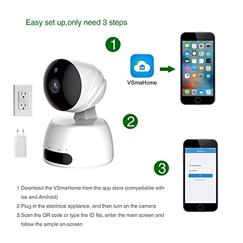-. Feature : Your home is on your phone: supports phone/ tablet/ PC viewing, helps you stay in touch with your home anytime and anywhere; And FPC antenna with wider coverage and 350-degrees rotation, there is no signal of blind zone / Good viewing quality: CMOS image sensor, Hi-Vision AR lens and the smart HDR display technology, make images clearer; Moreover, it has 8-times digital zoom, recording in 1080p HD to capture clear images and corners in your rooms / Clear night vision: provides 24 hours of security monitoring, powerful infrared IR light, ensure 26.3 feet of visible distance; Intelligently switch from day-to-night scene / Motion detection and 2-way audio: intelligent motion detection, 2-way voice built-in mic and speaker; App alerts with snapshot and record (SD card required) to your mobile device and you can immediately warn the invader with the speaker / Easy to set up and use: download the "VSmaHome" app, follow the instruction, configuration can be done in a few minutes; Supports remotely control the camera rotating to watch every corner indoor with VSmaHome view app (It's the update of the MIPC app, which specific designed for this model)