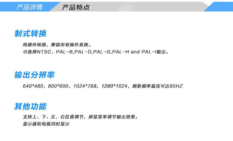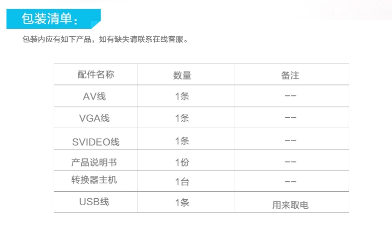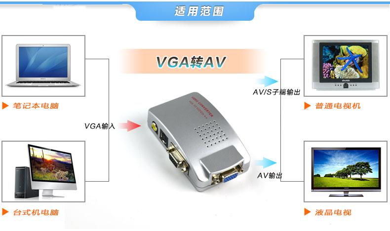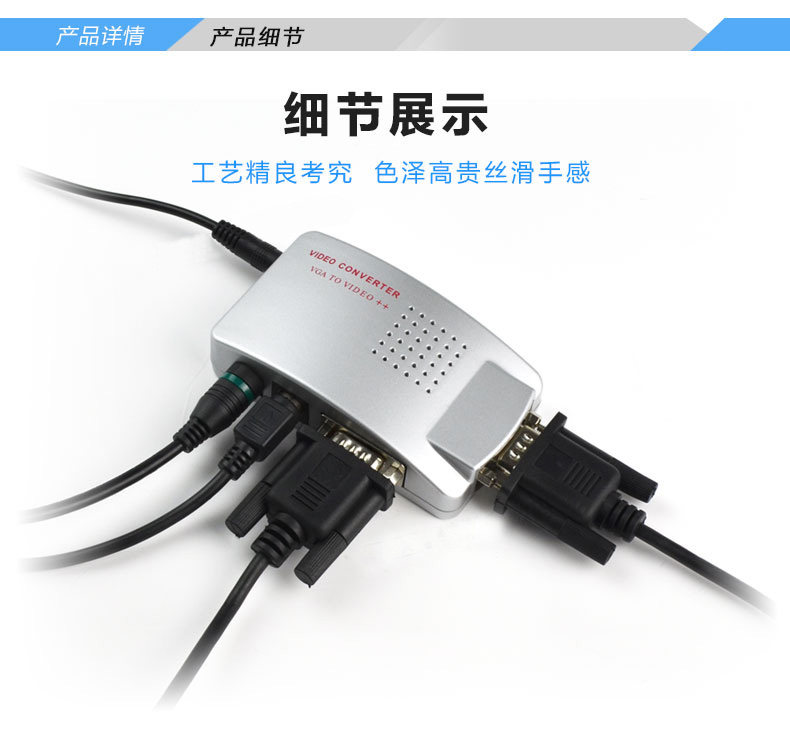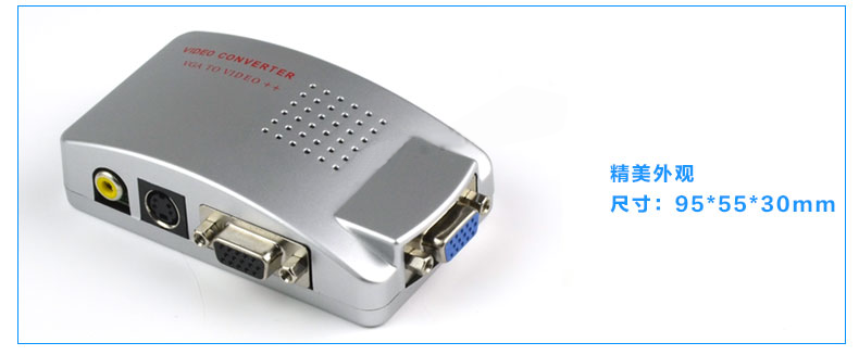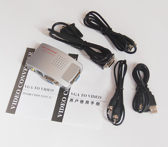 Description: Features:One input of VGA signals, one output of VGA signals.One output of Video, one out put of S Video.One ACPI of 5VResolutions of VGA signals: 640x480@60/72/75/75HZ,800x600@60/75Hz,1024x768@60/75Hz,1280x1024@60Hz.At the same time, output the VGA/Video/S-Video signals.Show Simultaneously pictures on the monitor and TV.Support the systems below: The TV systems of NTSC(Taiwan and USA), NTSC-EIAJ(Japan),PAL(Euro,China),PAL-M(Brazil),PAL-N(Uruguay Paraguay).Support the OVERSCAN and UNDERSCAN display mode.Convenient to carry because it is light,thin,short and small.Specifications:Volume: 100mm(length) x56mm(width)x36mm(height).packaging content:1 x PC VGA to Video Converter1 x VGA Cable(15 PIN)1 x S-VIDEO Cable1 x USB power Cable1 x AV Cable1 x Manual |