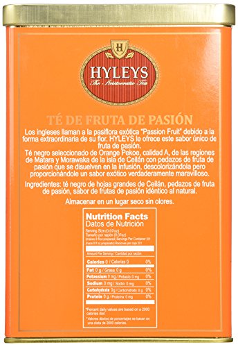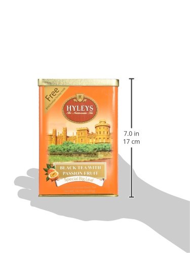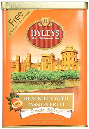 -. Binding : Grocery -. Brand : HYLEYS Tea -. EAN : 4791045010449 -. Feature : The English call the exotic pass flora passion fruit due to the unusual shape of its flowers / Hyleys offer you a unique passion fruit taste selected black tea of OPA grade from the regions of matara and morawaka of the island of Ceylon with passion fruit flavor / Ingredients: Ceylon big leaf black tea, passion fruit pieces, nature identical passion fruit flavor -. Label : HYLEYS Tea -. Manufacturer : HYLEYS Tea -. NumberOfItems : 1 -. PackageQuantity : 1 -. ProductGroup : Grocery -. ProductTypeName : GROCERY -. PublicationDate : 2014-12-14 -. Publisher : HYLEYS Tea -. ReleaseDate : 2015-01-20 -. Size : 14.11 Ounce -. Studio : HYLEYS Tea -. Title : HYLEYS Tea Black Tea with Passion Fruit, 14.11 Ounce