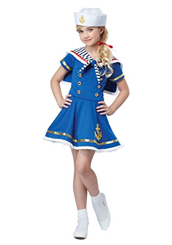 -. Brand : California Costumes -. Color : Multi -. Department : girls -. Feature : Sunny Sailor Girl Costume / Polyester knit dress has shiny gold buttons, gold trim, gold anchor applique, and white ruffle along skirt hem / Attached scarf has a blue and white stripe pattern, and red trim next to white ruffle / White hat has gold applique anchor on front -. Label : California Costumes -. Manufacturer : California Costumes -. MPN : CA00369 -. PackageQuantity : 1 -. PartNumber : CA00369 -. ProductGroup : Apparel -. ProductTypeName : APPAREL -. Publisher : California Costumes -. Studio : California Costumes -. Title : Sunny Sailor Girl Kids Costume