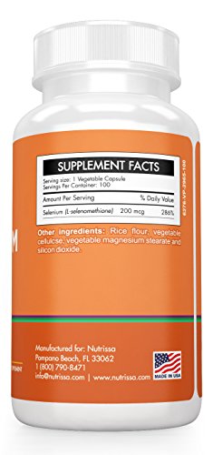 -. Binding : Health and Beauty -. Brand : Nutrissa -. EAN : 0646437338226 -. Feature : THYROID HEALTH SUPPORT - The thyroid gland has high amounts of selenium that play an important role in thyroid function. Studies sest that people-especially women-who have low blood levels of selenium might develop problems with their thyroid. / IMMUNE SYSTEM BOOSTER - Selenium is an essential trace mineral that can help boost white blood cells, which improves the body's ability to fight illness and infection as well as might help prevent some infections. / PROSTATE HEALTH - Lower levels of selenium in the blood can correspond to an increased risk of a prostate health problems / POWERFUL ANTIOXIDANT - Selenium helps fight damaging particles in the body known as free radicals. Free radicals can damage cell membranes and DNA, and may contribute to aging and serious health conditions. / NO RISK PURCHASE - Our products are manufactured in the USA in a GMP certified facility for unsurpassed purity and quality in every bottle, and backed by our 100% Lifetime Money Back Guarantee, click the Orange Button to order now! -. IsAdultProduct : 0 -. Label : Nutrissa -. LegalDisclaimer : These statements have not been evaluated by the Food and Drug Administration. This product is not intended to diagnose, treat, cure, or prevent any disease. -. Manufacturer : Nutrissa -. ProductGroup : Health and Beauty -. ProductTypeName : HEALTH_PERSONAL_CARE -. Publisher : Nutrissa -. Studio : Nutrissa -. Title : Selenium Supplement - For Thyroid, Immune System and Prostate Health - High Absorption 200mcg Yeast Free Selenium - Powerful Anti-Oxidant - 100 Veggie Capsules -. UPC : 646437338226