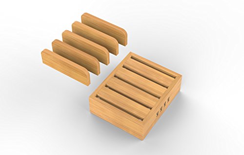 Innovative Design and Space Saving: Made of Bamboo from Remote Mountains, durable and environmental-Friendly; comes with 5 individual separators is sturdy enough for holding different size devices on the stand.