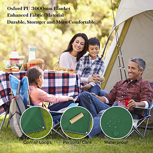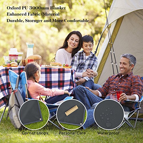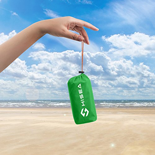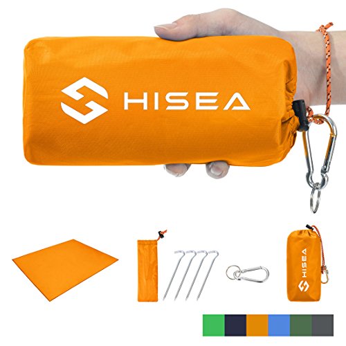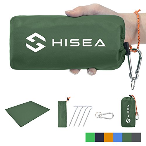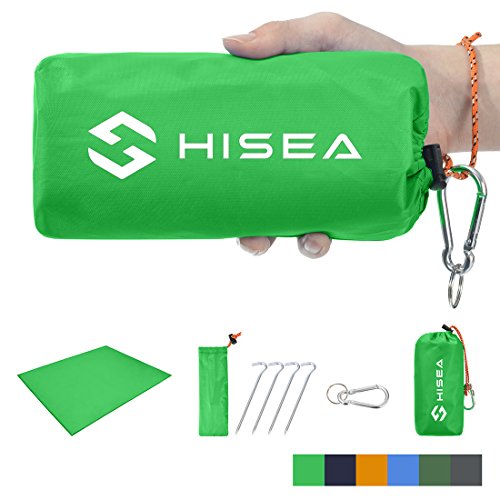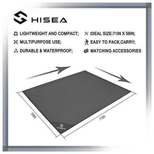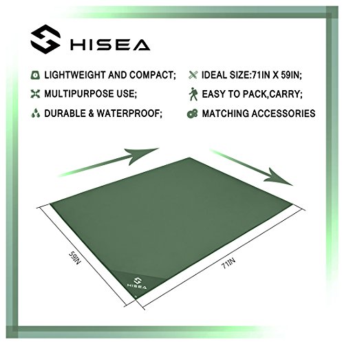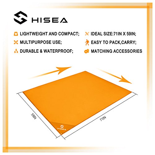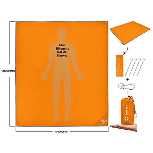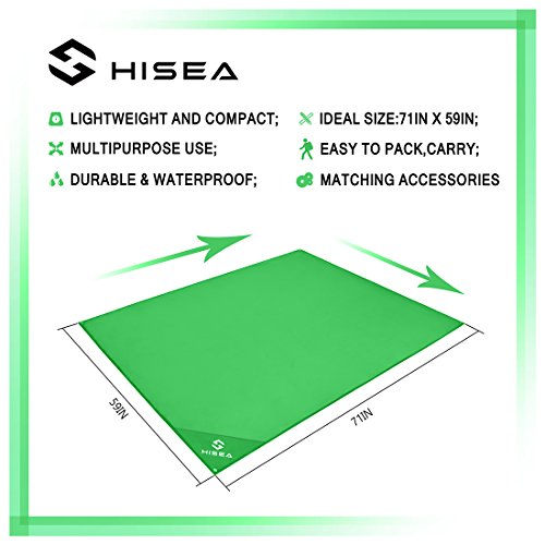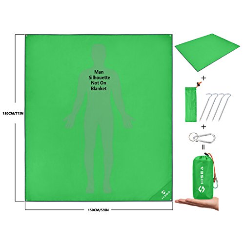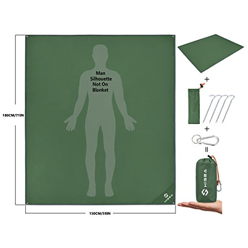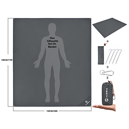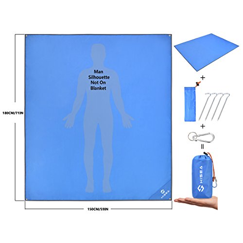 Studio : Hisea Publisher : Hisea Product Description Hisea Outdoor Camping Picnic Blanket Provide you a wonderful outdoor experience The Outdoor Mat is perfect for picnics, beaches, concerts, festivals, naps, tanning, yoga, etc. Take it to the park, the beach, sporting events and other outdoor activities. It is waterproof, sand proof, lightweight and easy to carry; With enhanced corner loop processing makes it more durable; with extra 4 strong anti-corrosive aluminum steel stakes(7inch long) to anchor down your lightweight blanket in different terrains like grass ground to prevent winds picking it up easily; A front multipurpose pockets can be used as small item storage (phone, iPad, book, etc.) Product Specification: Brand: Hisea Size : Unfolded 71 x 59 inch ( 180 x 150 cm ) , Folded 7 x 3.5 x 2.4 inch ( 18 x 9 x 6 cm); Materials: Improved and enhanced Oxford PU fabric; Package Included: Optimal Sized Blanket x 1 Anti-corrosive Stakes x 4 (with stuff sack) Climbing Carabiner x 1 (silver color) Stuff Sack with Compression Strap x 1