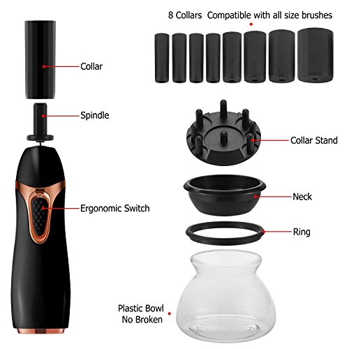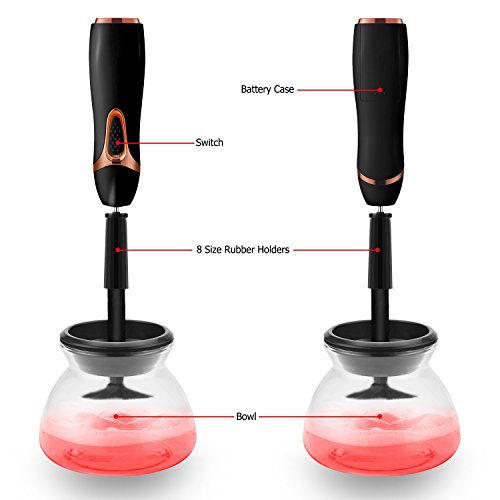 - FLEXIBLE & DURABLE RUBBER HOLDERS: This brush cleaner have 8 different sizes rubber holders(5mm,7mm,9mm,11mm,15mm,19mm,24mm,30mm), the flexible rubber holders can be variations so that fits your makeup brushes perfectly.
