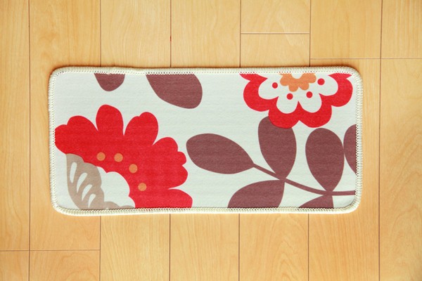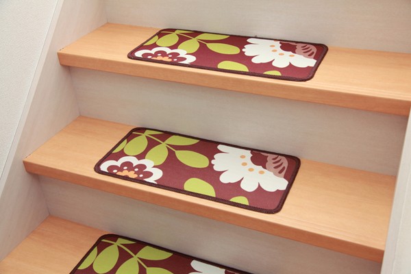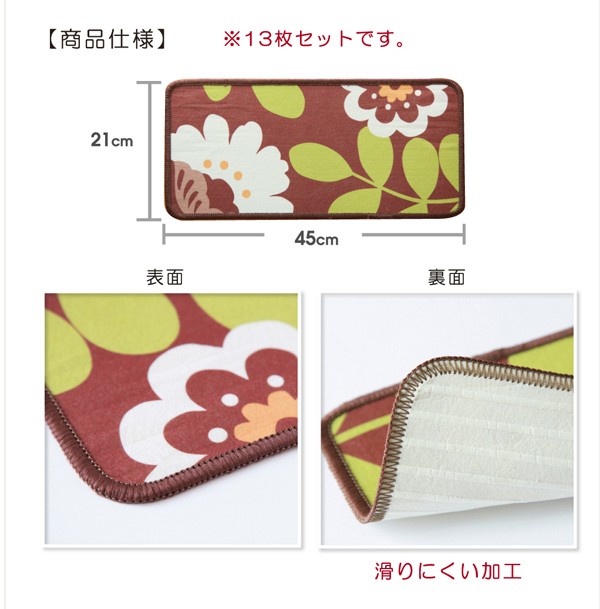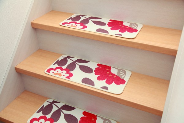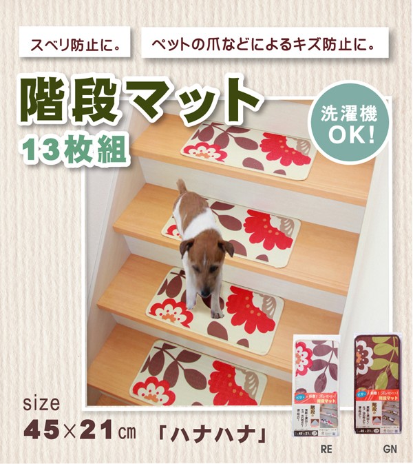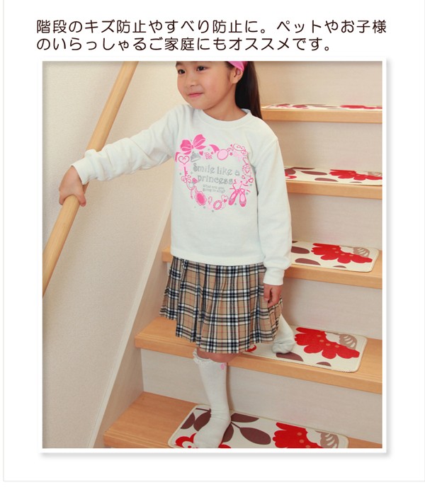 赤い色がアクセントのかわいらしい花柄をあしらった階段マットです。13枚入りです。ペットの滑り防止や爪による床の傷防止としてもご使用いただけます。裏面には吸着加工を施しています。