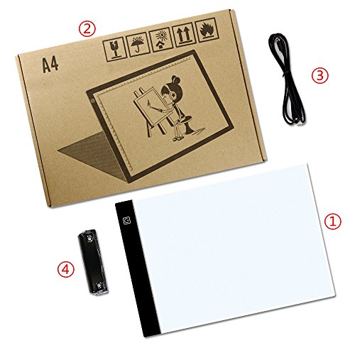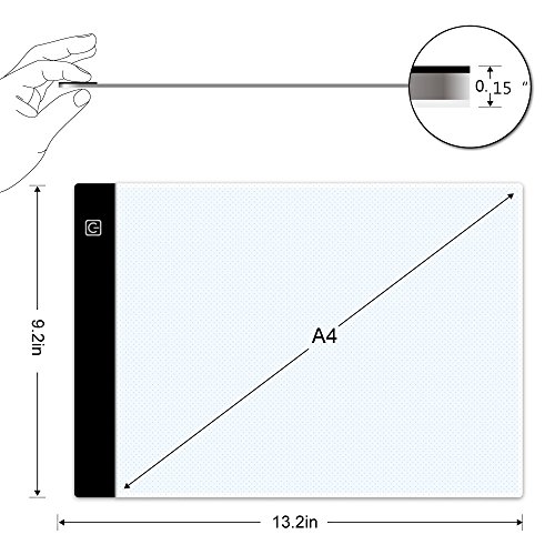 Specification: ●Model:A4 LED 3-level brightness light box ●Material:Acrylic(Organic glass) ●Outside Dimension (approx.):13.2*9.2inch ●Active Area (approx.):12*9.2inch ●Thickness(approx.):0.4cm ●Power Source:5V ●Wattage:1.8W ●Light Source:Flicker-Free Super Bright Eco-friendly LED ●Net weight(approx.):0.55kg ●Gross weight:0.7kg Precautions: ●Handly with Care.DO NOT use sharp metal objects.Protect working surface from scratches. ●Only use on a safe stable working surface. ●Warranty will be voided if tampered with. ●After use always store in a safe dry place." 0