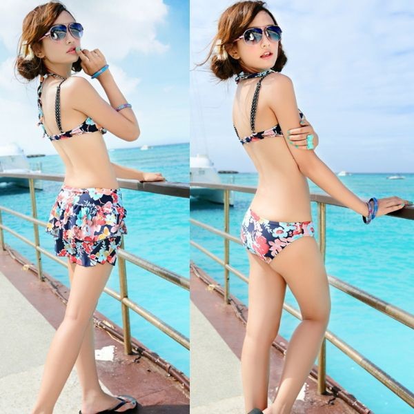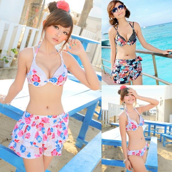 | 商品説明 | ショートパンツ付き 花柄 ドット柄 重ね着風 ビキニ 水着3点セット♪ 胸元のレイヤードデザインがレトロでキュート♪ フレアースカート風のショートパンツで動きやすさも抜群です。 |
