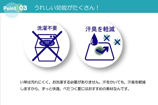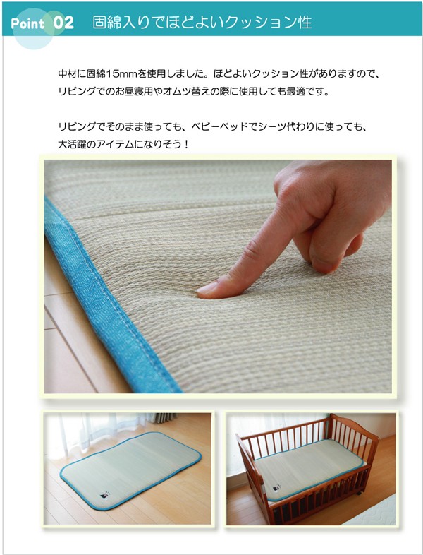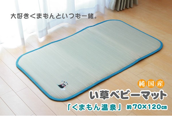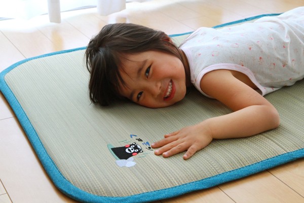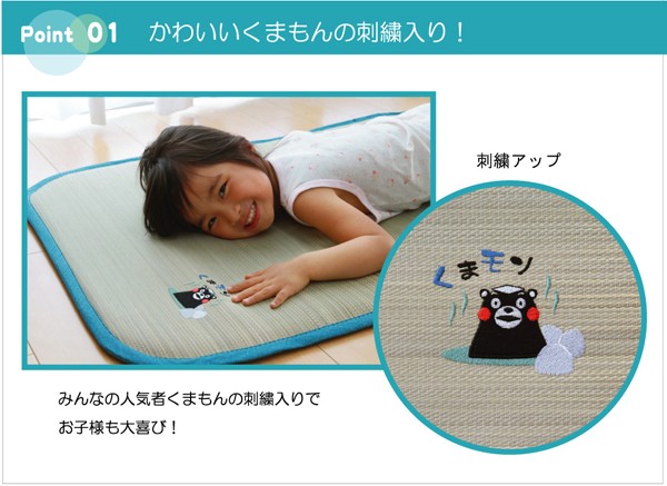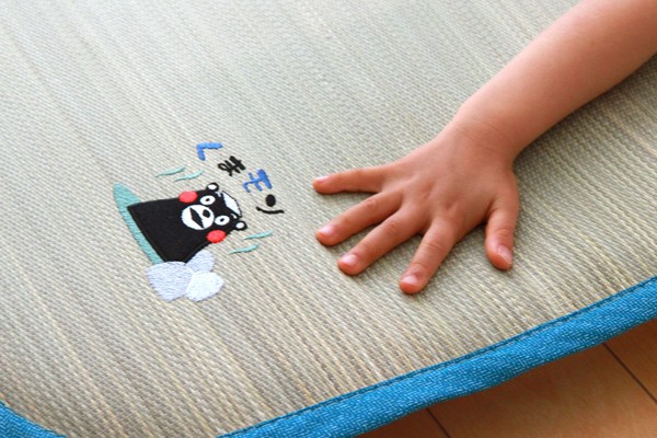 大人気キャラクターくまモンの刺繍がかわいらしいい草ベビーマットです。い草には1.綿の3倍の吸湿性があり汗のじめじめを軽減します。2.湿度の調整作用があり、蒸れにくく快適な就寝を促します。3.汗のにおいの元となる化学物質を90%以上抑え、においを軽減します。などの効果があります。中材にはクッション性にこだわり固わた15mmを使用していますので程良い弾力性があり、フローリングでも快適にご使用頂けます。青森ヒバ加工を施しています。(抗菌・防臭効果)