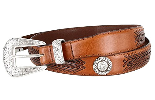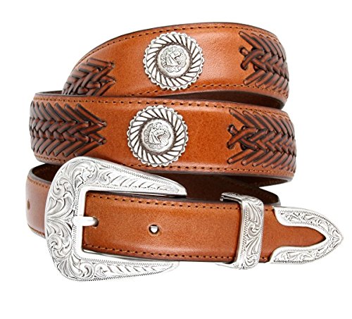 Binding : Apparel Product Description If you like to ride or if you simply like horses then this belt is right up your pasture. This belt contains horse head engraved conchos included with the 3 piece buckle set of embossed floral design. These fine stallions were engraved by a specialized artisan. This belt also comes with a braided body for that added stylish touch. Just trot right up to our pastures and don't hesitate to put your own hoof on it! Just pony up and this belt is yours. Don't wait and get it today! 0