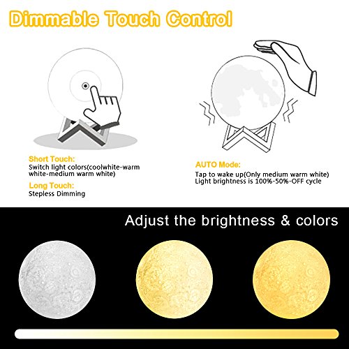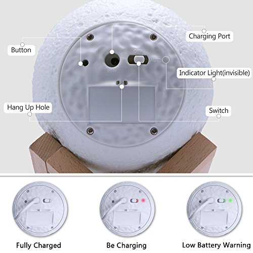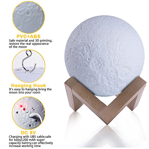 -. Feature : ★3D Printing Technology: Using the most advanced 3d printing manufacturing technology. / ★3 Dimmer Modes: Steady on-Touch Sensor-Stepless Dimming. The lights have 3 colors, cool white-warm white-medium warm white. AUTO: Touch the control switch within 1 second to switch light color, and touch more than 1 second to adjust the brightness of the light. / ★USB Charging: 1200mAh Built-in battery, after full charge(need 2 hours), the lamp can use 4 hours, Rechargeable battery and USB charging (include cable without adapter) / ★Hanging & Wooden Holder Decoration: There is a hole at the bottom of the moon lamp, you can hang it anywhere, kids bedroom, living room, dining room, office,etc. (include rope and hook) / ★You Can Get & Guaranteed: 1*Moon Lamp, 1*wooden holder, 1*USB cable, 1*rope&hook,1*user manual in English, German and Japanese. We can provide you with free replacement or refund when you are not satisfied with the product.