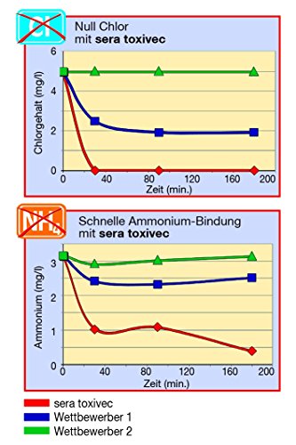 Studio : Sera North America, Inc. Publisher : Sera North America, Inc. Binding : Misc. Product Description First aid in aquariums: Immediately removes ichthyotoxic ammonia and nitrite. Binds heavy metals such as lead and copper. Removes chlorine and chloramines. Lowers nitrate levels and, correspondingly, algae growth. Due to destabilizing factors (including overfeeding, high fish density, new setups, larger maintenance efforts or using treatments), massive pollution peaks by ichthyotoxic pollutants such as ammonia and nitrite may suddenly occur in aquarium water. In such emergency situations, sera toxivec immediately removes these toxic substances as well as other dangerous substances such as chlorine and heavy metals. The natural equilibrium quickly reestablishes after having removed the pollutants without the necessity of repeated stress causing large water changes. 0