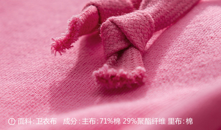 | 面 料:71%棉 29%聚酯纤维 罗纹:97.9%棉 2.1%氨纶里 料:棉颜 色:玫红 |