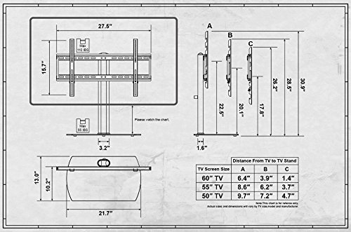 -. Feature : 8mm black tempered glass,Capacity for shelf:55lbs, 110lbs for mount,80*40mm iron tube with cable management system to hide the messy cable / Smart Design! - This tabletop TV stand with black tempered glass shelf looks simple and elegant. / Masterfully Hide your Wires! - No need to see those wires anymore! A specially designed wire management is made to hide all your wires. Power cords, HDMI cables and the like are well hidden from view. This also enables you to hide the wires without going through the wall and making holes and or hiring an electrician to do it. / Shelf width 13inch, mount Max. depth 27.5 ".The rack has three different heights can be adjusted 26.2"/28.5"/30.9".This unit weight is at just 19pounds. / This mount will fit most TVs from 32 to 65inches in size and weight up to 110 pounds. To make sure this mount will fit insure your TV's VESA bolt pattern falls between these two sizes : 100(h)mm x 100(w)mm up to 400(h)mm x 600(w)mm. If your TV's VESA pattern falls between these two sizes then it will fit your TV. If you need further help, please contact us.