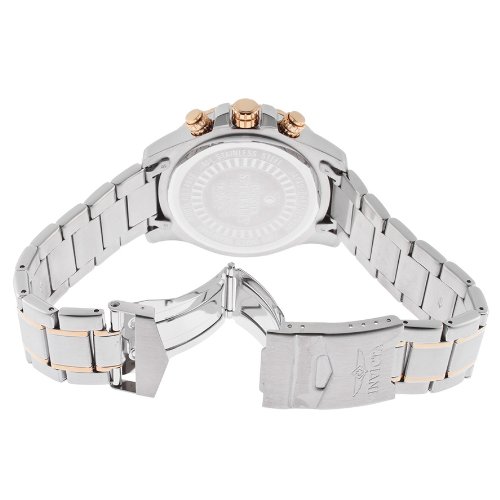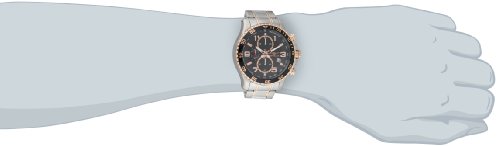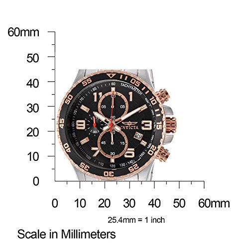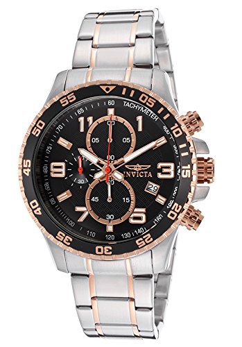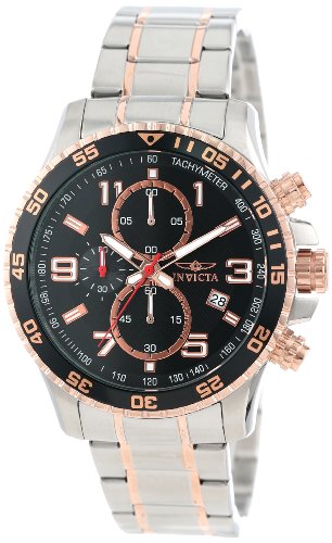 ReleaseDate : 2013-09-03 Studio : Invicta Publisher : Invicta Binding : Watch Product Description Stainless steel case with a stainless steel bracelet with rose gold-tone accents. Uni-directional rotating rose gold-tone bezel with black top ring. Black textured dial with luminous rose gold-tone hands and Arabic numeral and stick hour markers. Tachymeter around the outer rim. Dial Type: Analog. Luminescent hands and markers. Date display at the 4 o'clock position. Chronograph - three sub-dials displaying: 60 second, 60 minute and 1/10th of a second. Quartz movement. Scratch resistant mineral crystal. Pull / push crown. Solid case back. Case diameter: 45 mm. Case thickness: 13 mm. Round case shape. Band width: 22 mm. Band length: 9 inches. Fold over clasp with safety release. Water resistant at 50 meters / 165 feet. Functions: chronograph, date, hour, minute, second. Sport watch design. Invicta Specialty Chronograph Black Dial Stainless Steel Mens Watch 14877 0