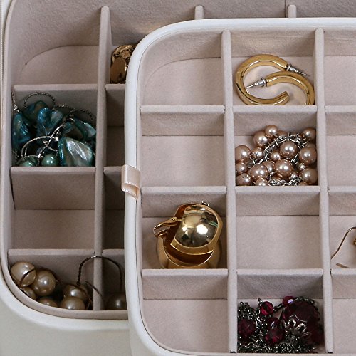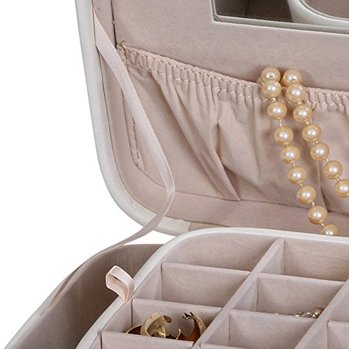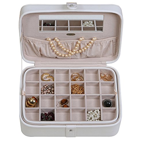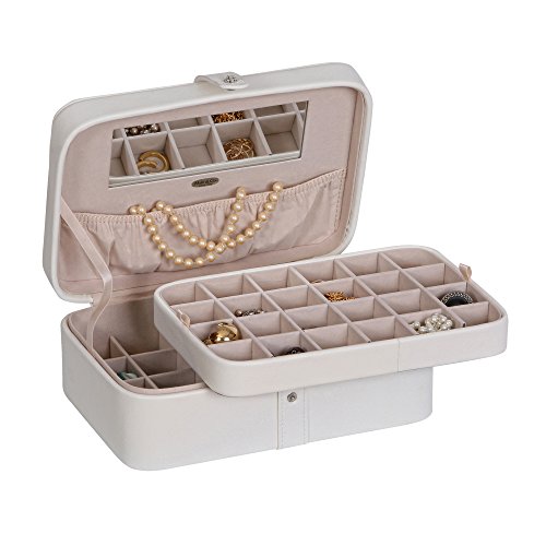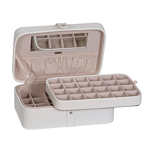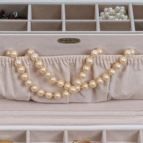 Supple and sophisticated, the Mele & Co. Lila forty-eight section jewelry box offers two story storage. A delightfully plush exterior opens up to a twenty-four compartment lift out tray plus twenty-four sections beneath - offering forty-eight sections in all - each measuring 1.5" square. Sturdy dividers keep your earrings and rings easily corralled and well organized, making selection simple and enjoyable. Dividers can also be removed from the jewelry box to make room for larger accessories. The interior lid features a mirror to help you choose just the right piece as well as a Mele & Co. logo plate, accenting the company's brand legacy. Lid also includes a shirred catch pocket for larger hoop or chandelier earrings, bracelets and more. With so much storage in a fashion forward package, this jewelry case is a double decker delight! Dimensions: 10 1/2" L x 7 1/2" W x 4" H.Feature