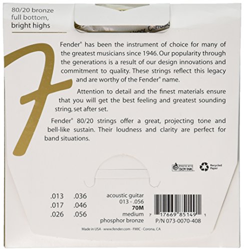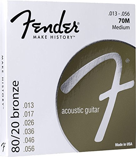 ReleaseDate : 2010-09-21 Studio : Fender Musical Instruments Corp. Publisher : Fender Musical Instruments Corp. Binding : Electronics Product Description Fender acoustic 80/20 bronze feature a loudness andclarity that stand out especially well in band situations.their brightness also complements dark and dullsounding acoustic guitars, bringing them to life. fender acoustic 80/20 bronze are an excellentall-purpose string, whose clear, even tones make themthe perfect choice for most styles of acoustic music. 0
