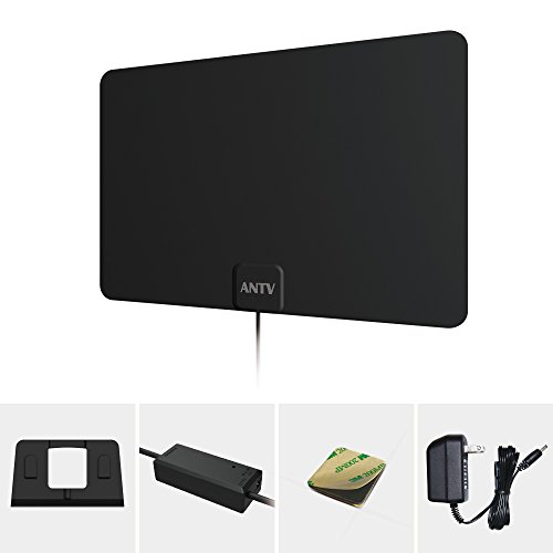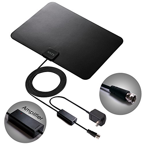 ANTV Ultra Thin Indoor TV Antenna, with Detachable Amplifier Signal Booster and 12V DC Adapter,Ideal design for both Digital and Analog Free TV Channel Reception, 50 Mile Range, 10 Feet Coaxial Cable