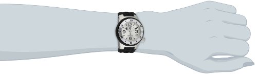 Silver dial with silver tone and black hands, black hour markers and Arabic numerals; luminous; unidirectional stainless steel bezel with silver tone top ring; stainless steel screw-down crown