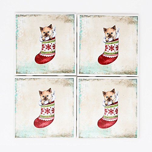 Marbleobject Christmas Cats Lover Wishes Dinner Table Ceramic Coasters with Cork Backing Set of 4 Handmade