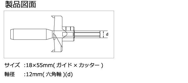 | サイズ | サイズ:18×55mm(ガイド×カッター)、軸径:12mm(六角軸)(d) 個装サイズ:7×15×6cm |