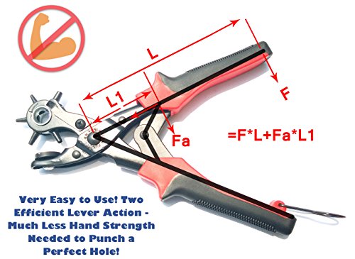 - Feature : HIGHEST QUALITY MATERIAL: very high carbon steel; among the strongest punch plier on the market / 60 DAYS MONEY BACK GUARANTEE OR FREE REPLACEMENT: if you don't like it, return it within 60 days / MUCH LESS HAND STRENGTH NEEDED: easy to punch a clean hole because of the two efficient lever action / PRECISE AND SHARP: the wheel is 90° fixed on the anvil so therefore you can punch a perfect hole / FOR DIFFERENT MATERIALS: punches round holes in leather, plastic, canvas, cardboard, shoe and rubber