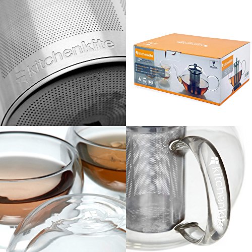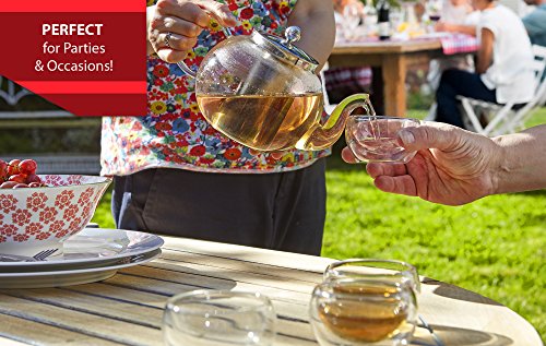 [ COMPLETE TEA POT SET ] Not only are you getting a teapot but also 4 double walled glass cups, making it a complete serving set. Drink with style and not worry about matching tea cups anymore! The tea maker comes with a rust-free stainless steel tea strainer basket holds teabags or loose tea leaves which can be removed after your tea has steeped. The deep infuser goes right to the bottom of the teapot so that if you only make tea for one or two, you don't have to fill it right up to the top!