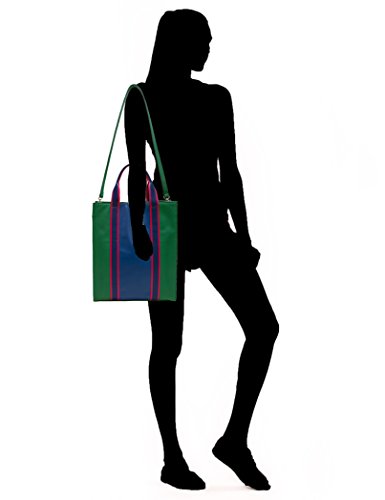 Color-blocked tote bag made with cross-hatch vegan leather, striped webbing, and detachable shoulder strap