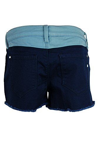 Stretch denim. Medium blue at front, dark blue at back. Low rise. Cut off hems. Zip fly with button closure. Belt loops. 5 pocket styling. Silver-toned button and rivets. Silver designer logo at back pocket.