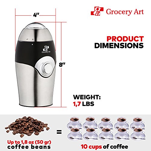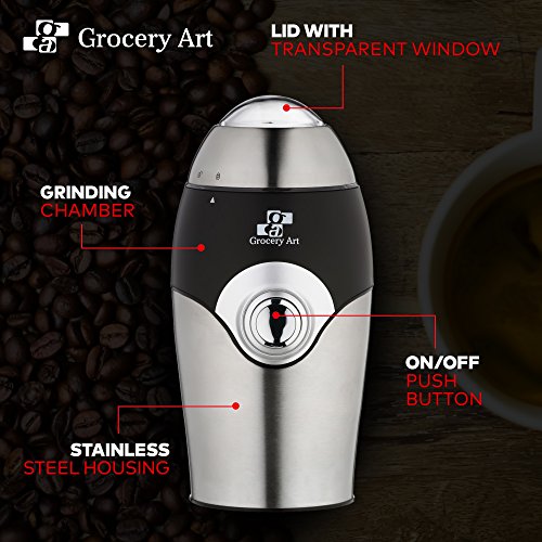 Studio : Grocery Art Publisher : Grocery Art Product Description Grocery Art Grinder Appliance - Safe Dependable Coffee Accessories for the Smart Java Guru! Fill your cup with the freshest flavors when you burr your beans with the Grocery Art grinder machine. Handles All Grinding Needs Replace all of your grinders with this one heavy duty plug-in grinder too. Equipped with strong blades that grind up even the coarsest salt or coffee beans, this all-in-one grinding machine can be used as a grinder for herb, a grinder for tobacco, an electric pepper grinder or even as a nut grinder for cooking. Grinds At Lightning Speeds The innovative design of our electric coffee grinder provides it with the ability to deliver grinds in no time. In just 20 seconds or less, your coffee grounds, salt grounds or herb grounds will be ready to go! No more fussing fumbling around with a clunky grinder that takes forever to produce a proper grind. (Shorter grind times render coarser grounds longer grinding times make for ultra fine grounds.) Small Compact Appliance Small enough to sit on your counter top without taking up too much room, this space-saving coffee grinder is ideal for kitchens of all sizes. It's the best electric spice grinder to have around when spicing dishes with herbs spices such as Sea Salt, whole peppercorns, nutmeg, parsley, cinnamon dried sage. Grinding whole spices herbs is the best way to ensure all of the flavors are fresh robust! Chef's Favorite Gift Idea Home chefs looking to save time when whipping up culinary creations those who enjoy brewing their own coffee turn to our grinder tool because it delivers maximum convenience. What other coffee bean grinder works as fast as efficiently as ours? We don't mean to brag but it's the best one around! 0