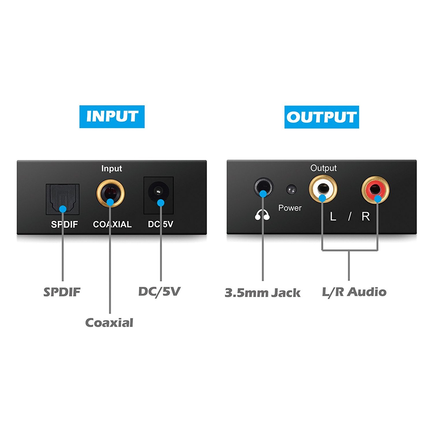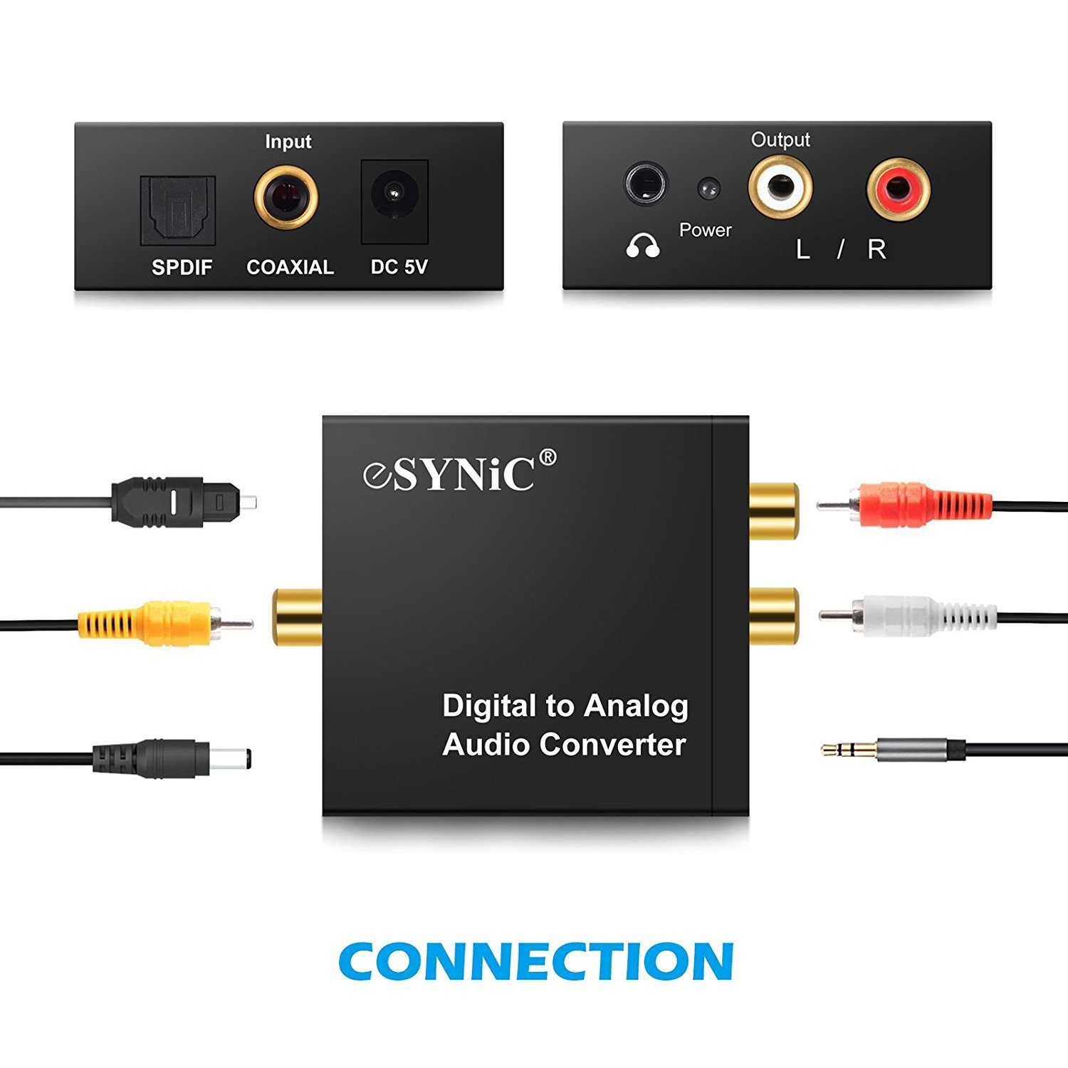 The digital (optical / coaxial) to analog (RCA) audio converter simultaneously converts coaxial and optical digital audio signals to analog L / R RCA and 3.5 mm jack audio signals.