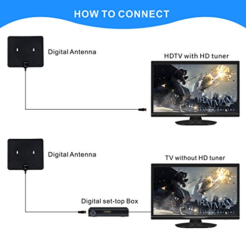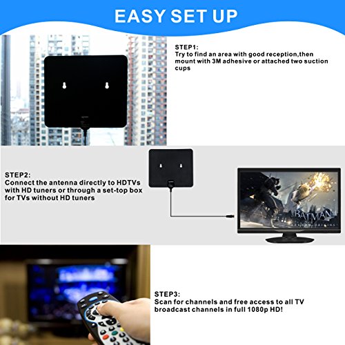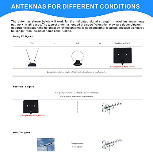 Studio : Leadsign Automotive Electronics Publisher : Leadsign Automotive Electronics Binding : Electronics Product Description Style:35mile Leadsign 35miles Indoor HDTV Antenna Features: 1)Enjoy crystal clear HDTV shows,720p,1080i,1080p/ATSC available. 2)Didn't come with an amplifier;adopted a new technology,excellent reception to get the best signal from the desired station.So if other similar antenna can not work as expected,this one may satisfy you. 3)Performs best at receiving VHF and UHF channels. 4)A minute to set up for a lifetime of free high-def TV. Leadsign 35mile Digital TV Antennas Specs: Frequency range:170-240MHz,470-862MHz Receiving range:FM/VHF/UHF Gain:5dB Impedance:75Ω Coax Cable Length:16.5ft(5m) Choose the Right Antenna: 1,Before you buy, find out what channels and signals are available in your area.Visit:http://dtv.gov/maps or http://www.tvfool.com. 2,Antennas for different conditions: 1) Simple indoor antennas may be sufficient for locations having strong TV signals; 2) High quality indoor antenna or an outdoor antenna may be appropriate for locations with moderate TV signals; 3) An outdoor antenna is suitable for locations with weak TV signals. 3,35miles antenna works best for 0-35miles local DTV station;50miles antenna,works best for 35-60miles local DTV station. 4,Channels reception usually depends on what's being broadcast in your area,how far away you are from broadcast towers and your surroundings. TIPS: 1,If your antenna doesn't work as expected: 1) Make sure you have correctly connected the antenna to your HDTV or digital converter box; 2) Set the mode to Antenna or Air in the TV's set up menu and re-scan for channels; 3) Reposition the antenna in a different location,such as higher on a wall or closer to a window;Facing the direction of the broadcast tower;Always re-scan for channels after moving the antenna. 2,If you can not get a clear signal,just try the antenna in different locations,sometimes moving a few feet can make a difference. 0 |