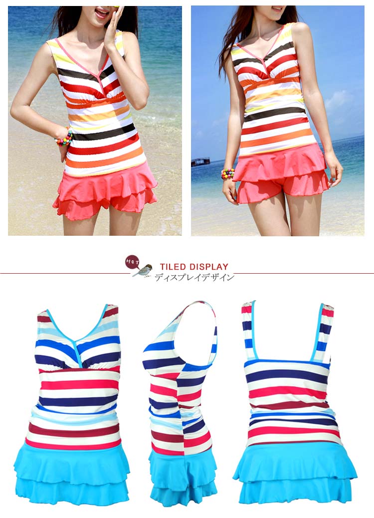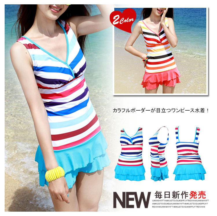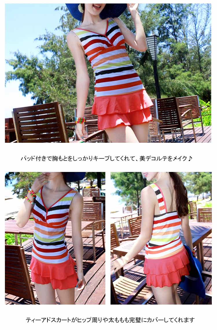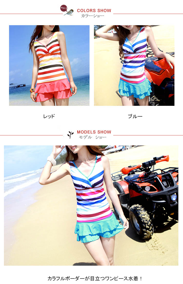 | カラフルボーダーが目立つワンピース水着!ティーアドスカートが大人可愛い◎Vネックはきちんとパイピングされ、美デコルテをアピールパッド付きで胸もとをしっかりキープしてくれて、美デコルテをメイク♪ティーアドスカートがヒップ周りや太ももも完璧にカバーしてくれます | |