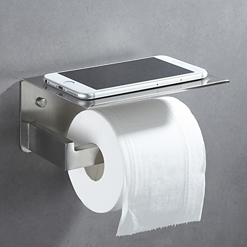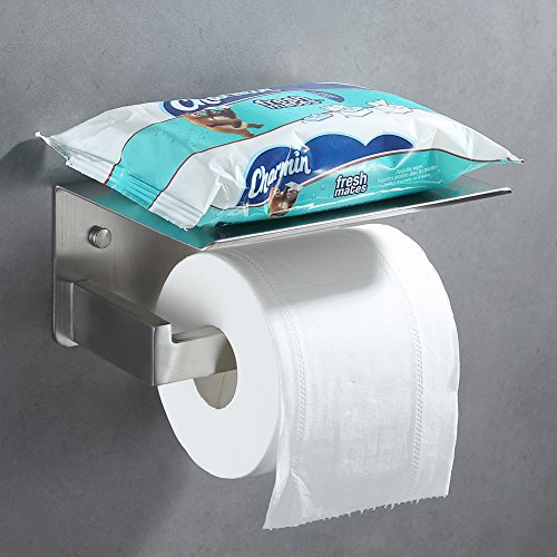 - 【MULTI-USE】strong toilet paper roll holder, bonus multipurpose storage shelf! Easily LARGE ENOUGH to rest various items on, e.g. cell phone, blue speaker, wet wipes, wipe container, liquid soap, lotion, air freshener, plantlet, hand towel, wallet, watch, keys, glasses, small books etc. when you go to WC or have a shower,perfect for whichever roomy or small bathrooms.