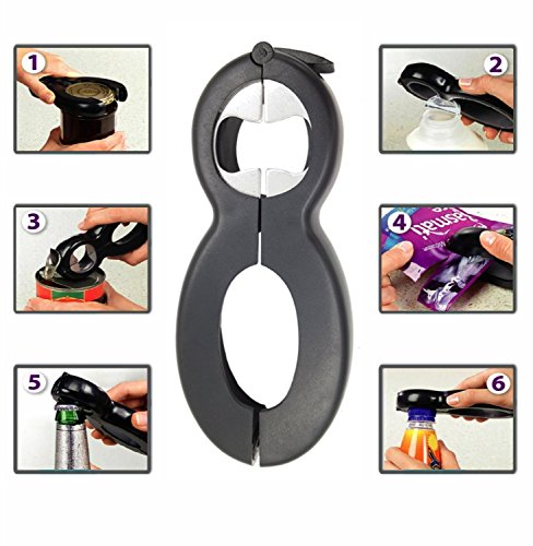 - 6 FUNCTION OPENER Effortlessly slice open hard to open sealed packages with the built in blade function. Open water and soda bottles smoothly. Pop caps off bottles instantly with the bottle opener function. Easily twist off screw caps with a simple twist. Clamp down on food seals to instantly remove pull tabs. Remove a variety of lids from your favorite foods. Hook onto sealed canned foods to simply peel back the metal tab saving your fingers