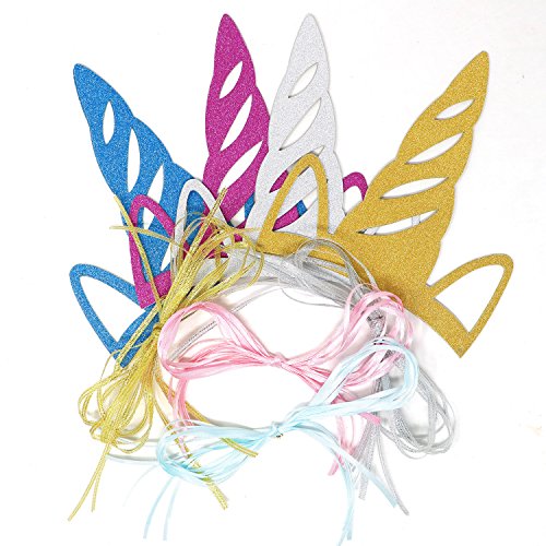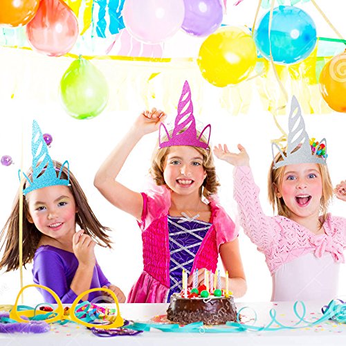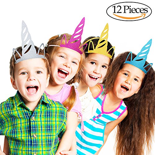 -. Feature : MADE OF GLITTER CARDBOARD: Our unicorn party hats are made of glitter colored cardboard, light and comfortable to wear. / FASHION DESIGN: With the pretty unicorn hat you will be the spotlight of the party. It is the perfect accessory for unicorn party. Have a bit fun and laughter in the party putting your unicorn hat on. / SUITABLE FOR KIDS AND ADULTS: Cute size unicorn hat, 7.1"x 5.9". Common using to fit the size of each person's head, suitable for all ages of birthday, holiday and theme parties. / PERFECT PARTY SUPPLIES: Unicorn party hats are ideal for kids and adults in birthday party, wedding parties, bridal shower, baby shower, holiday, tea party, graduation party, Halloween costume accessory, dress up activity or party gifts. / PACKAGE INCLUDE: 12pcs unicorn design party hats ( 3pcs gold, 3pcs silver, 3pcs red, 3pcs blue) and 24 party colored strings to put the hats on.