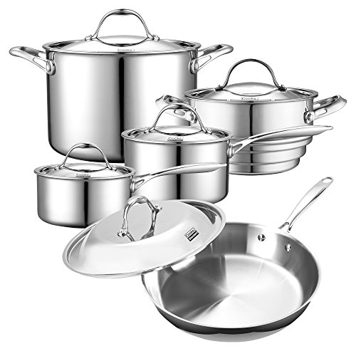 The Cooks Standard 10-Piece Multi-Ply Clad Cookware Set, Stainless Steel includes: 1.5 and 3 qt saucepan with lids, 8 qt stockpot with lid, 11 in./4 qt sauté pan with lid, and a steamer insert with lid that fits both 1.5 and 3 qt saucepans. Multi-ply construction has 2 layers of stainless steel and an aluminum core along base and walls. Stainless steel is durable and looks great. Aluminum core for even heat distribution and prevents hot spots. Stainless steel lids keeps heat and moisture in. Riveted handles stay cool and are comfortable to hold. Induction compatible. Works on gas, electric, glass, ceramic, etc. Oven safe to 500F. Dishwasher safe.Feature