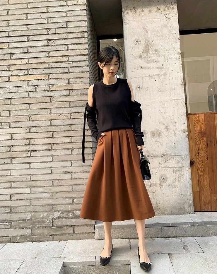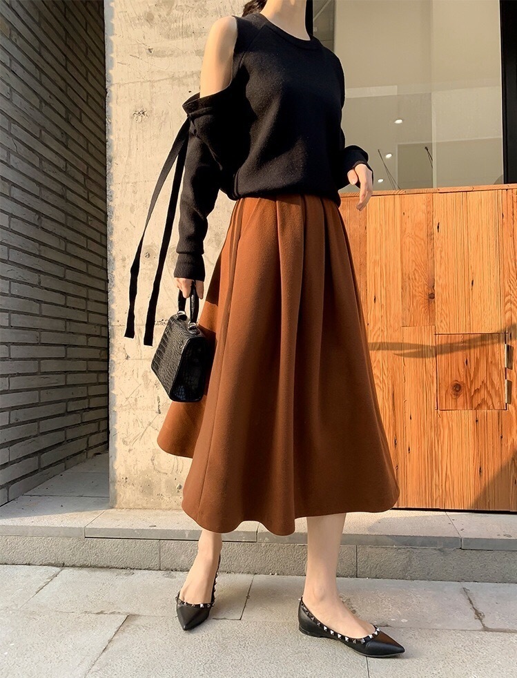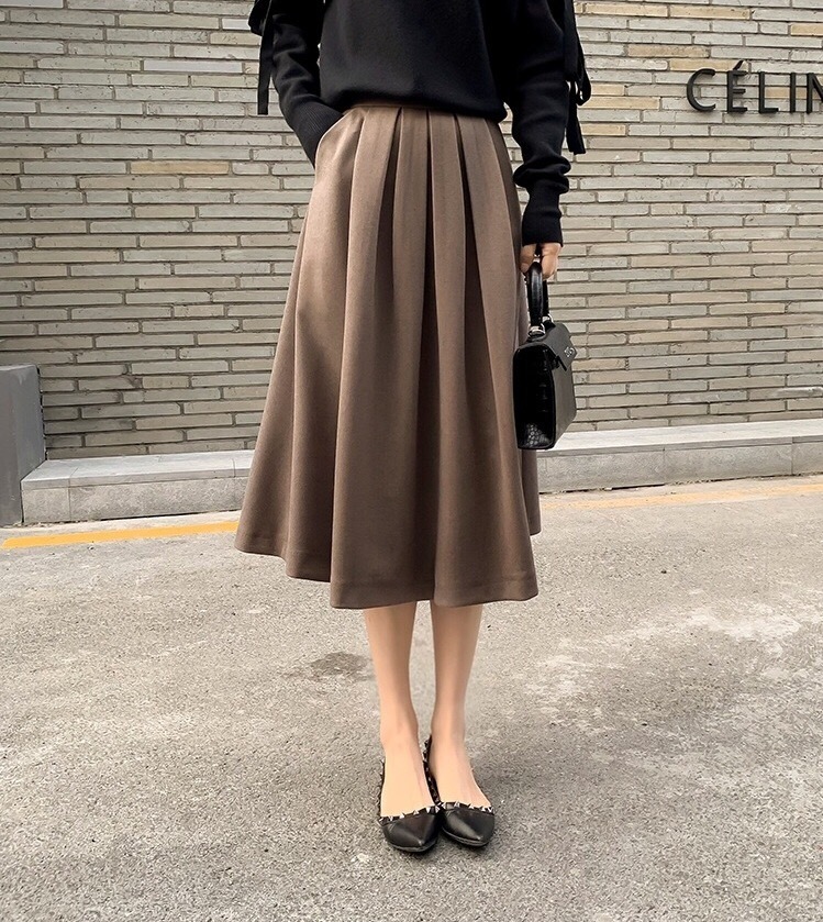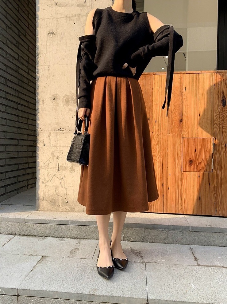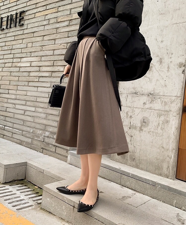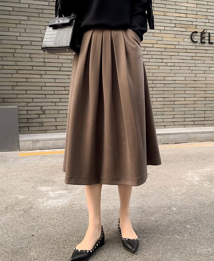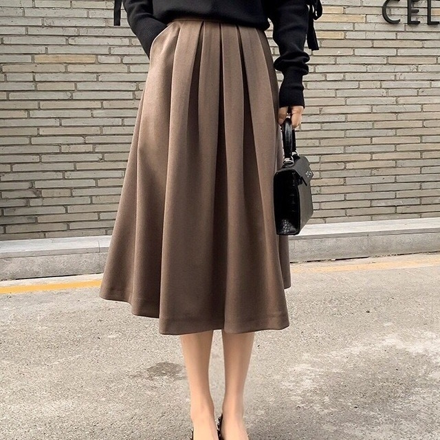 落ち着いたカラーが上品で大人っぽい雰囲気の膝丈フレアスカートです。